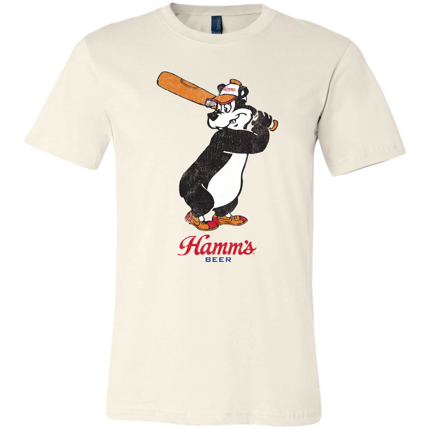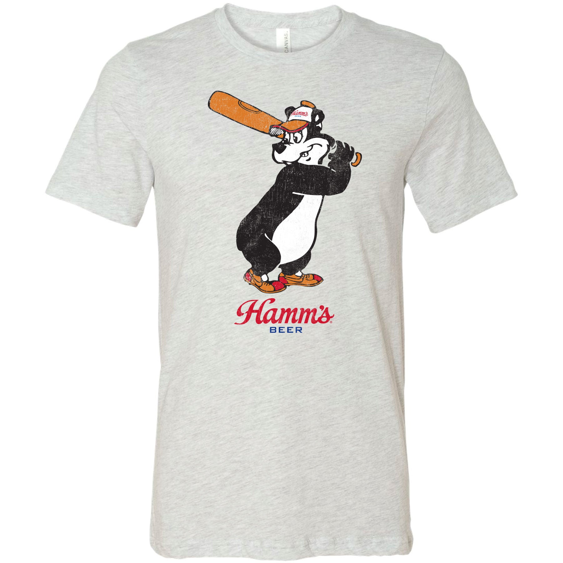 This Hamm's Bear T-shirt features the iconic bear up to the plate, ready to bat. Show your love for the classic beer and America's favorite pastime with this unique and stylish shirt. Perfect for game days, backyard BBQs, or just lounging with a cold Hamm's beer. Officially licensed Hamm's® clothing & apparel.