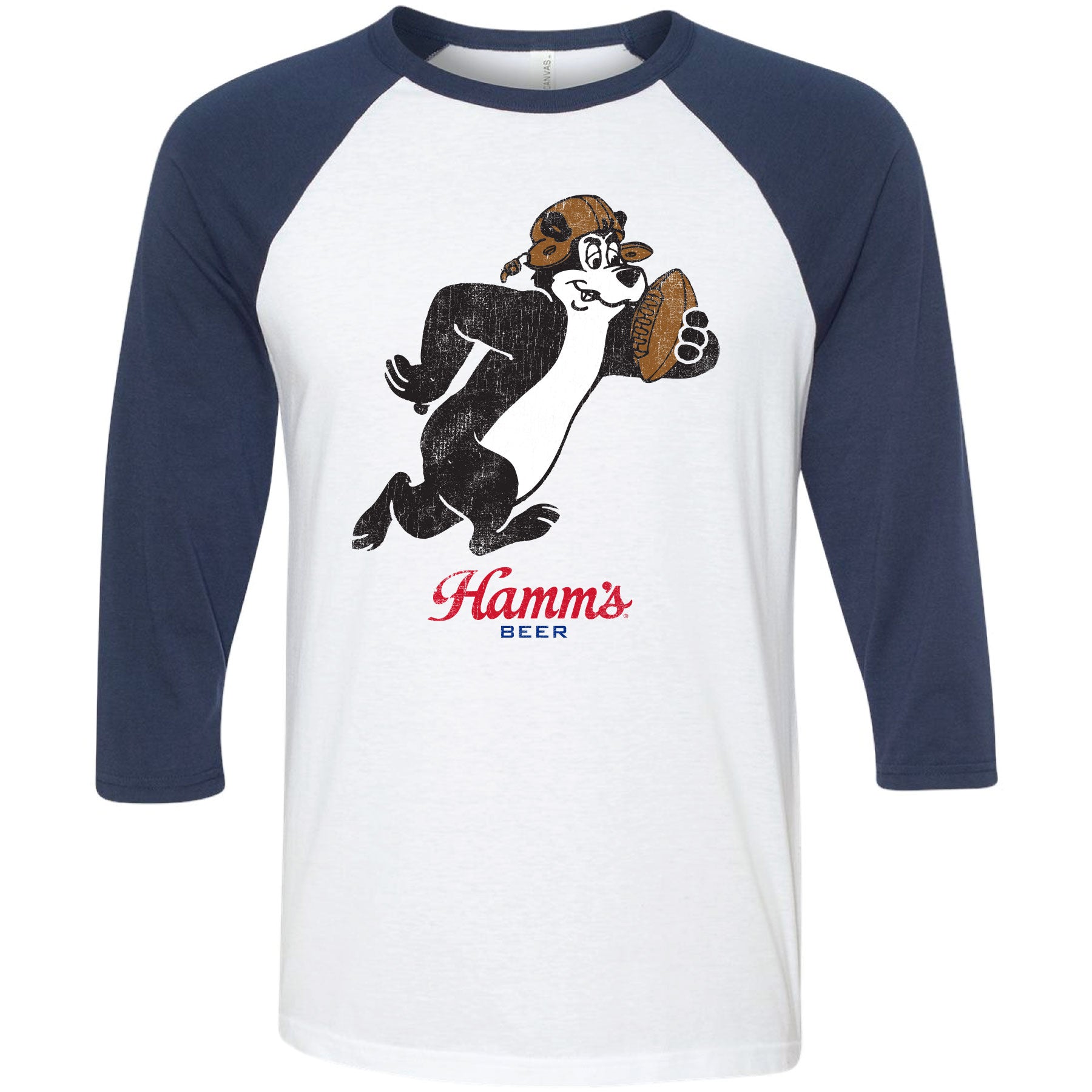 Introducing the iconic Hamm's Bear on a Football Run Play Raglan 3/4 T-shirt! Made with high-quality materials, this shirt is perfect for sports fans and beer enthusiasts alike. Show off your love for Hamm's and football with this stylish and unique tee. Officially licensed Hamm's® clothing & apparel.