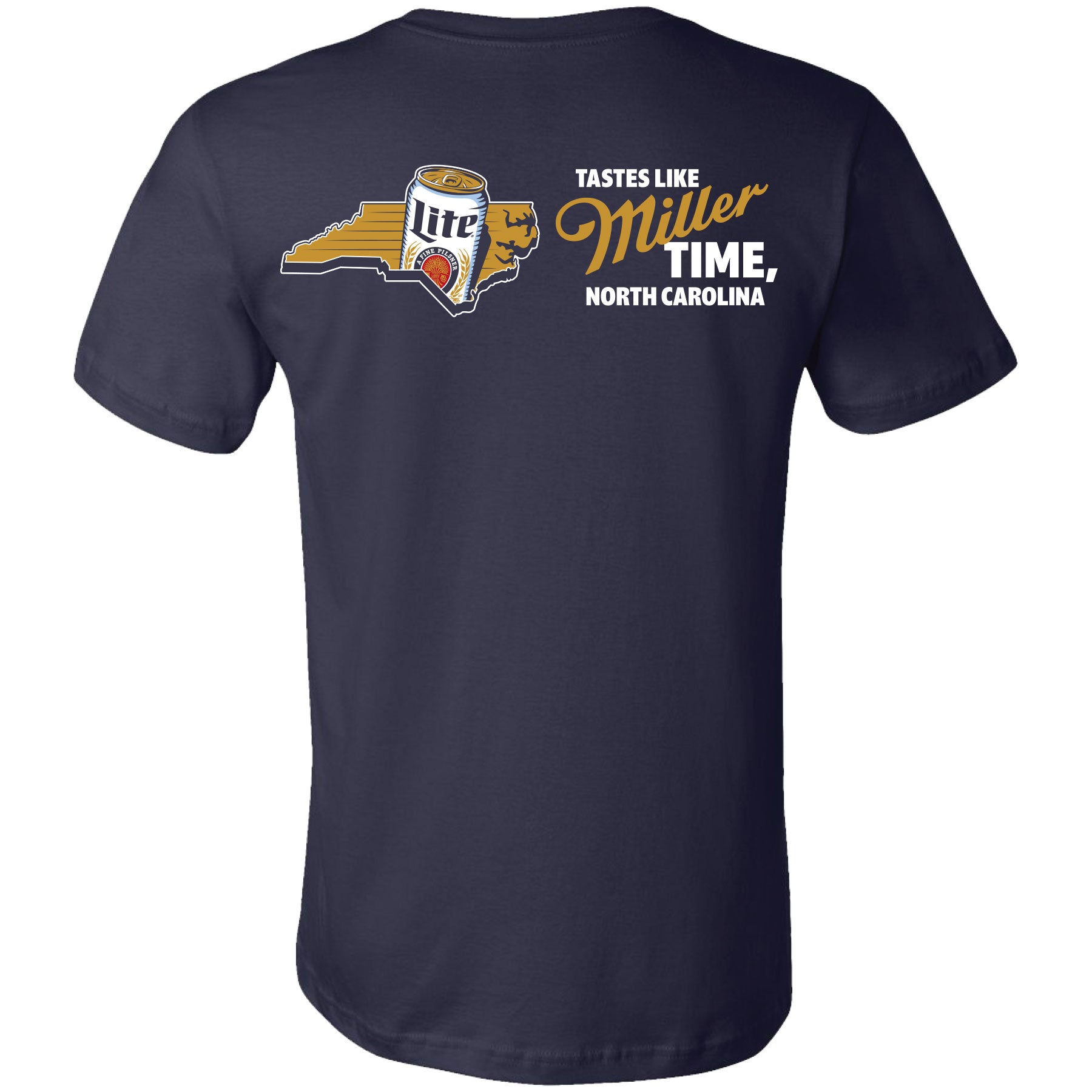 Show off your love for Miller Lite and your home state with this stylish t-shirt. The front features a unique design of a Miller Lite can within the shape of North Carolina, while the back boasts the slogan 'Tastes Like Miller Time'. Made with high-quality materials and a comfortable fit, this shirt is perfect for any beer enthusiast. Officially licensed Miller Lite® clothing, apparel & merch.