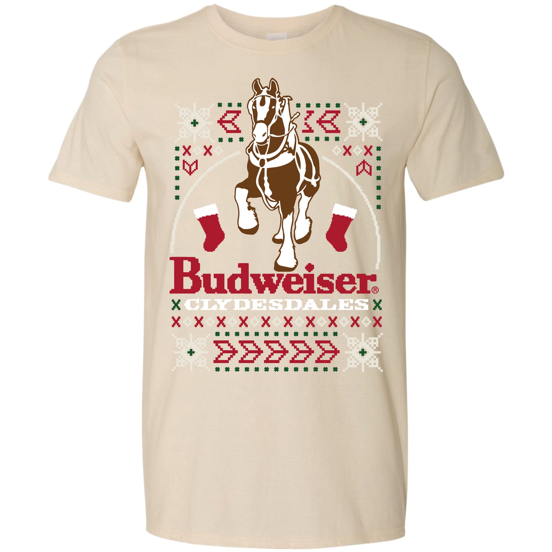 Experience the iconic Budweiser Clydesdales like never before with our Ugly Sweater T-Shirt. Show off your holiday spirit with the world-famous Budweiser Clydesdale displayed prominently on the front. Expertly designed and crafted with quality materials, this t-shirt is a must-have for any Budweiser fan. Officially licensed Budweiser® apparel.