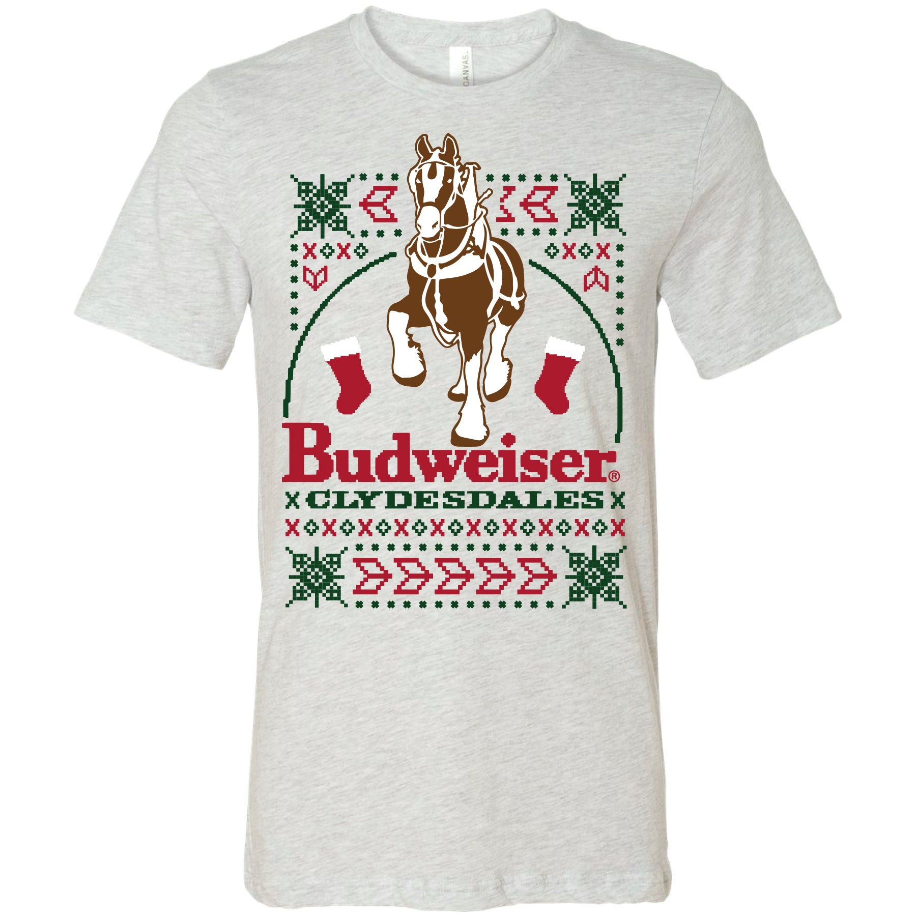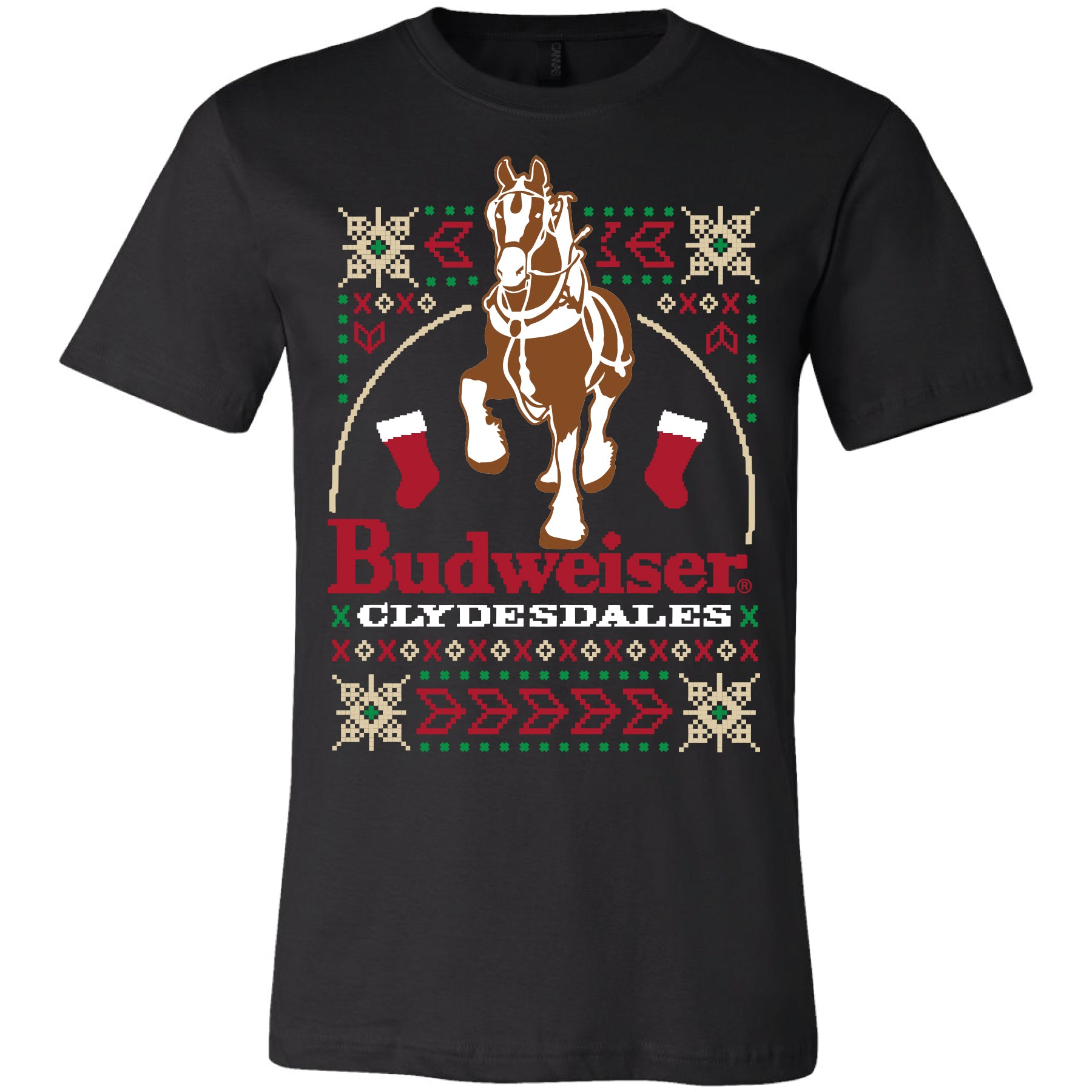 Experience the iconic Budweiser Clydesdales like never before with our Ugly Sweater T-Shirt. Show off your holiday spirit with the world-famous Budweiser Clydesdale displayed prominently on the front. Expertly designed and crafted with quality materials, this t-shirt is a must-have for any Budweiser fan. Officially licensed Budweiser® apparel.