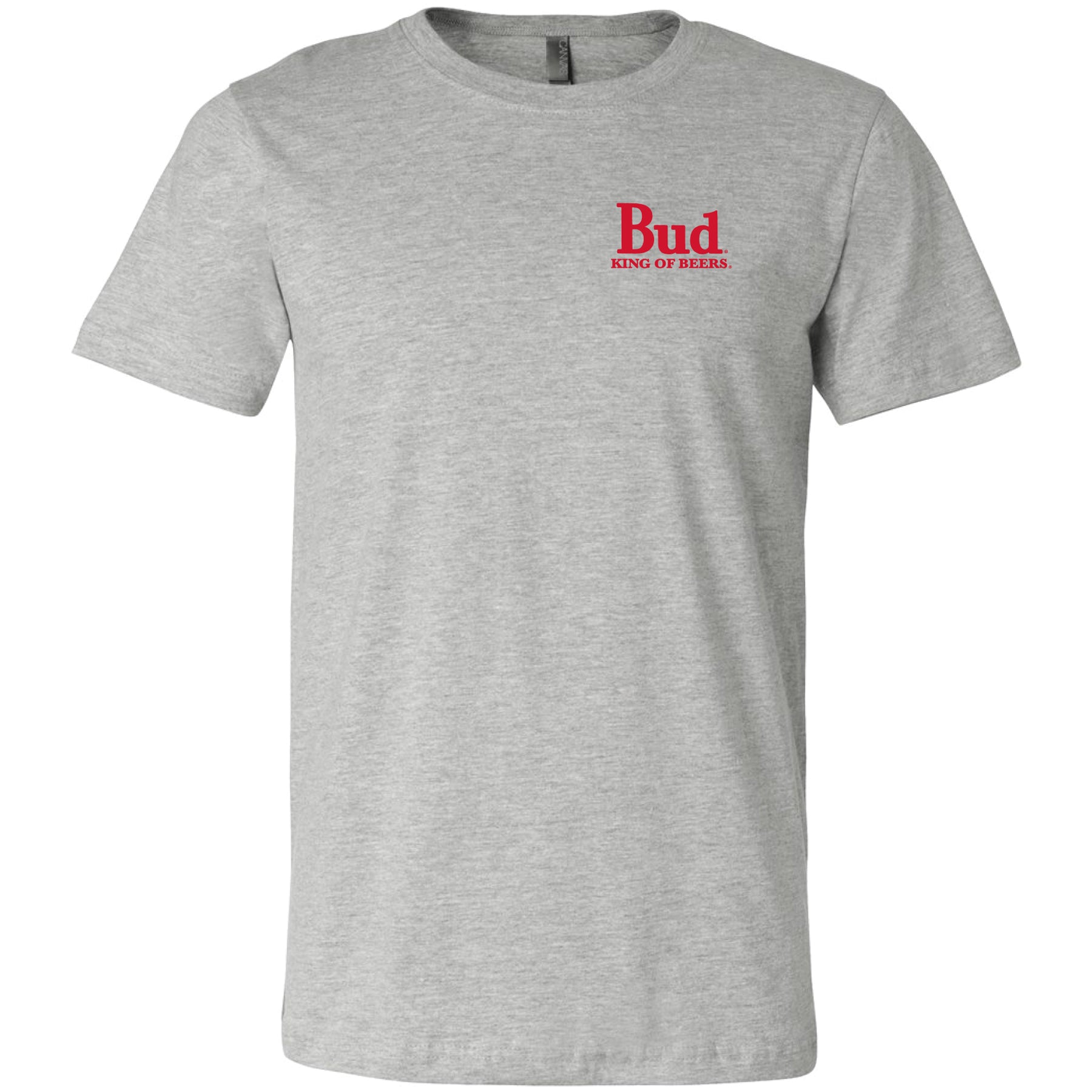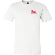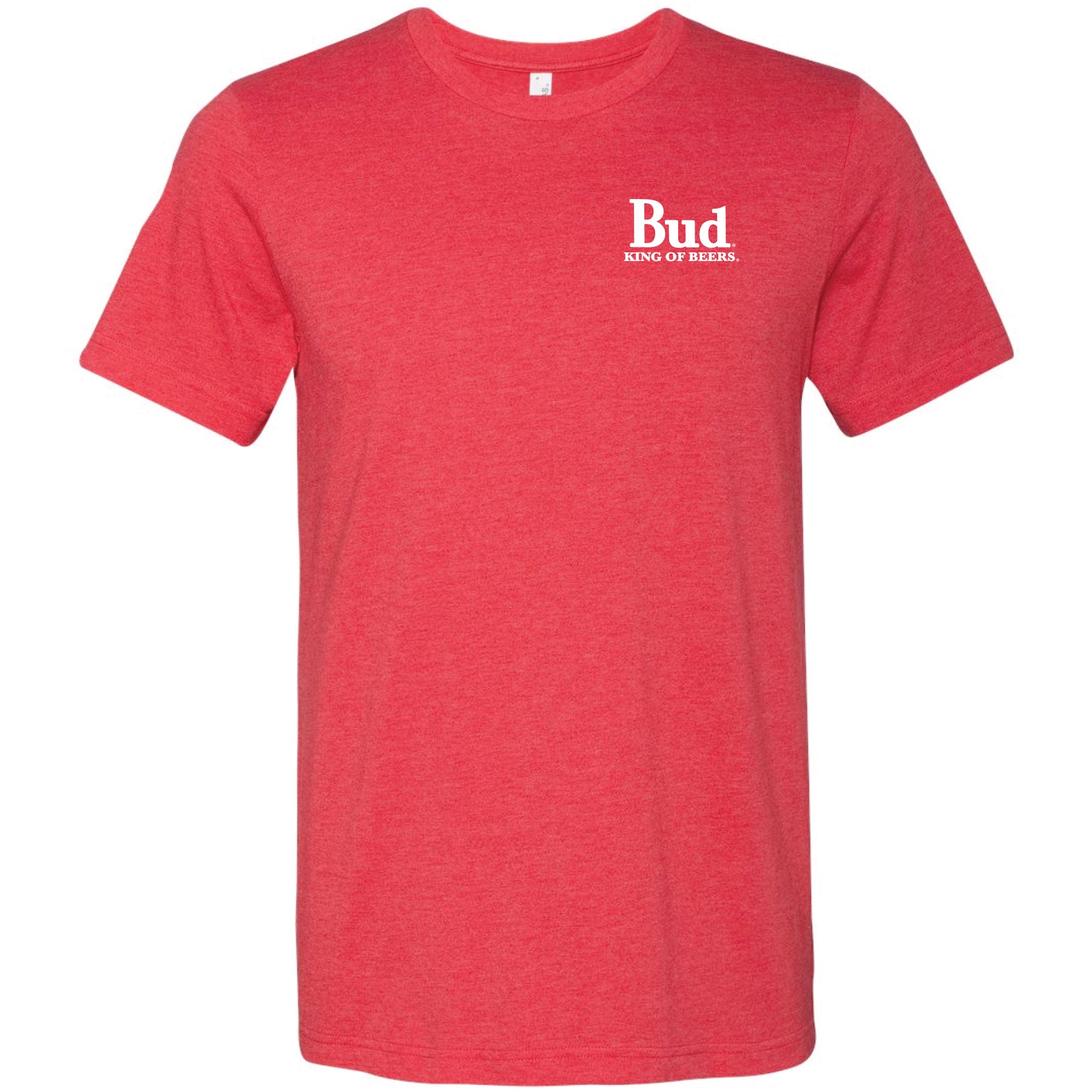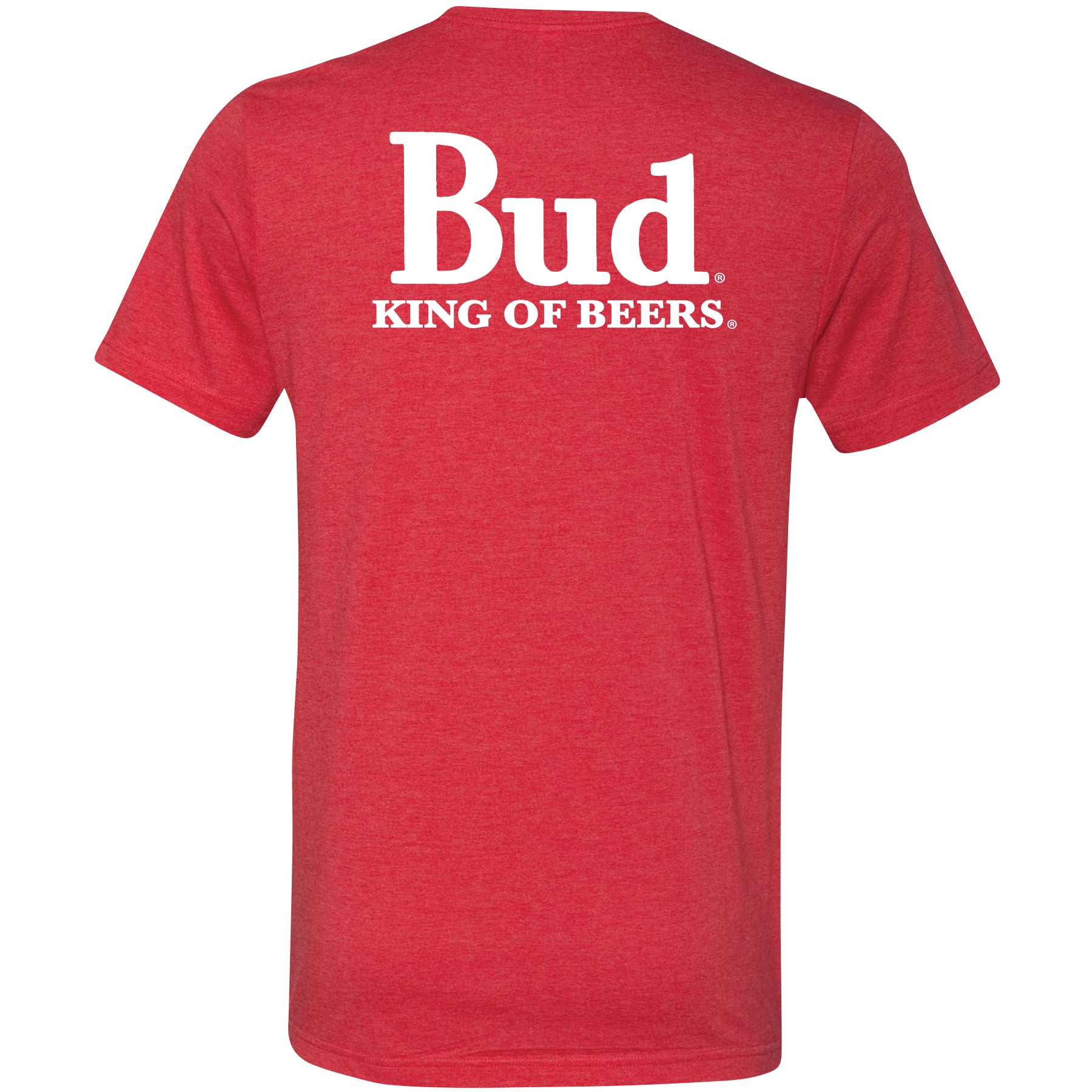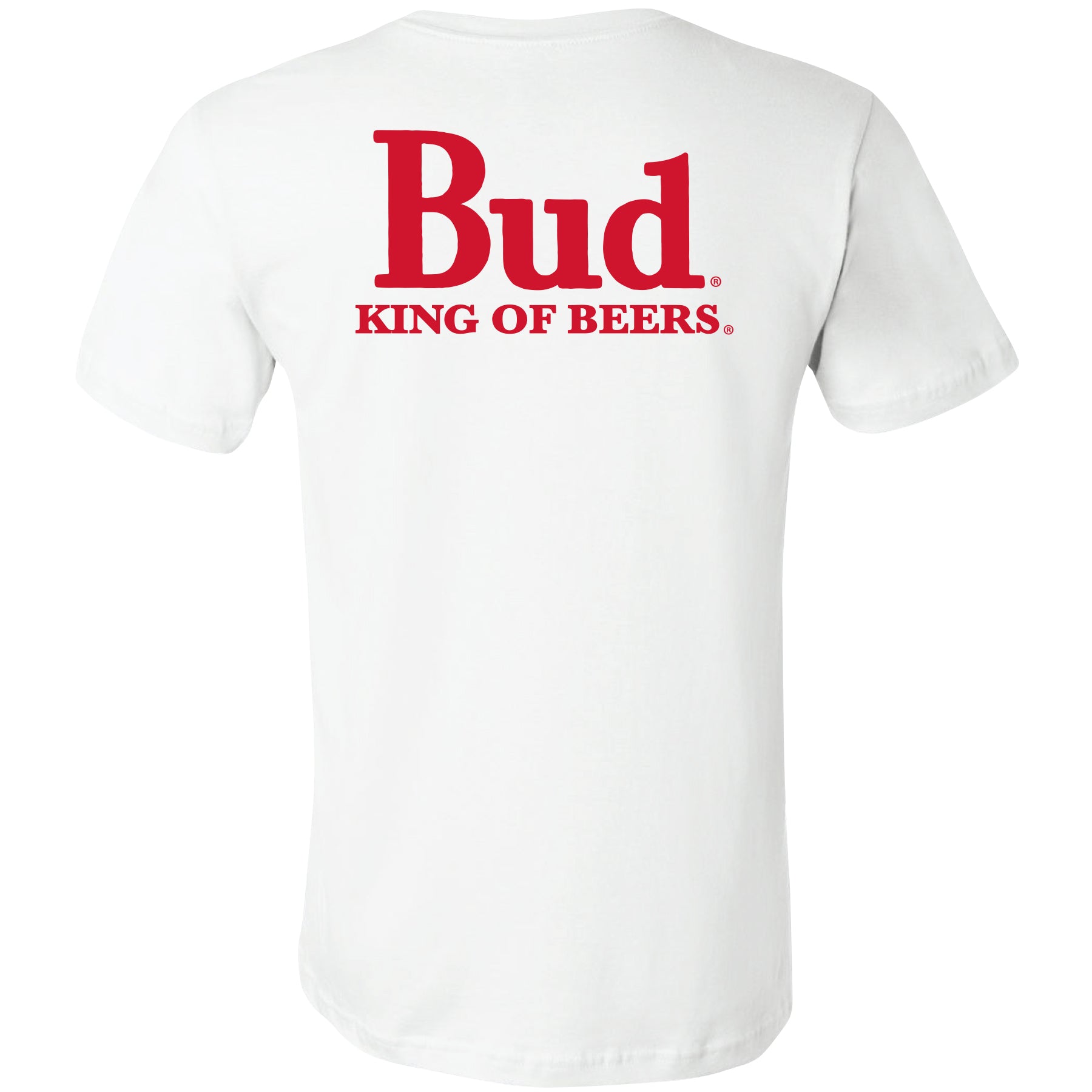 Budweiser King of Beers 2-Sided T-Shirt. The Bud King of Beers Logo is featured on the Left Chest and again as a large print on the back of the T-Shirt. Officially licensed Budweiser® apparel.