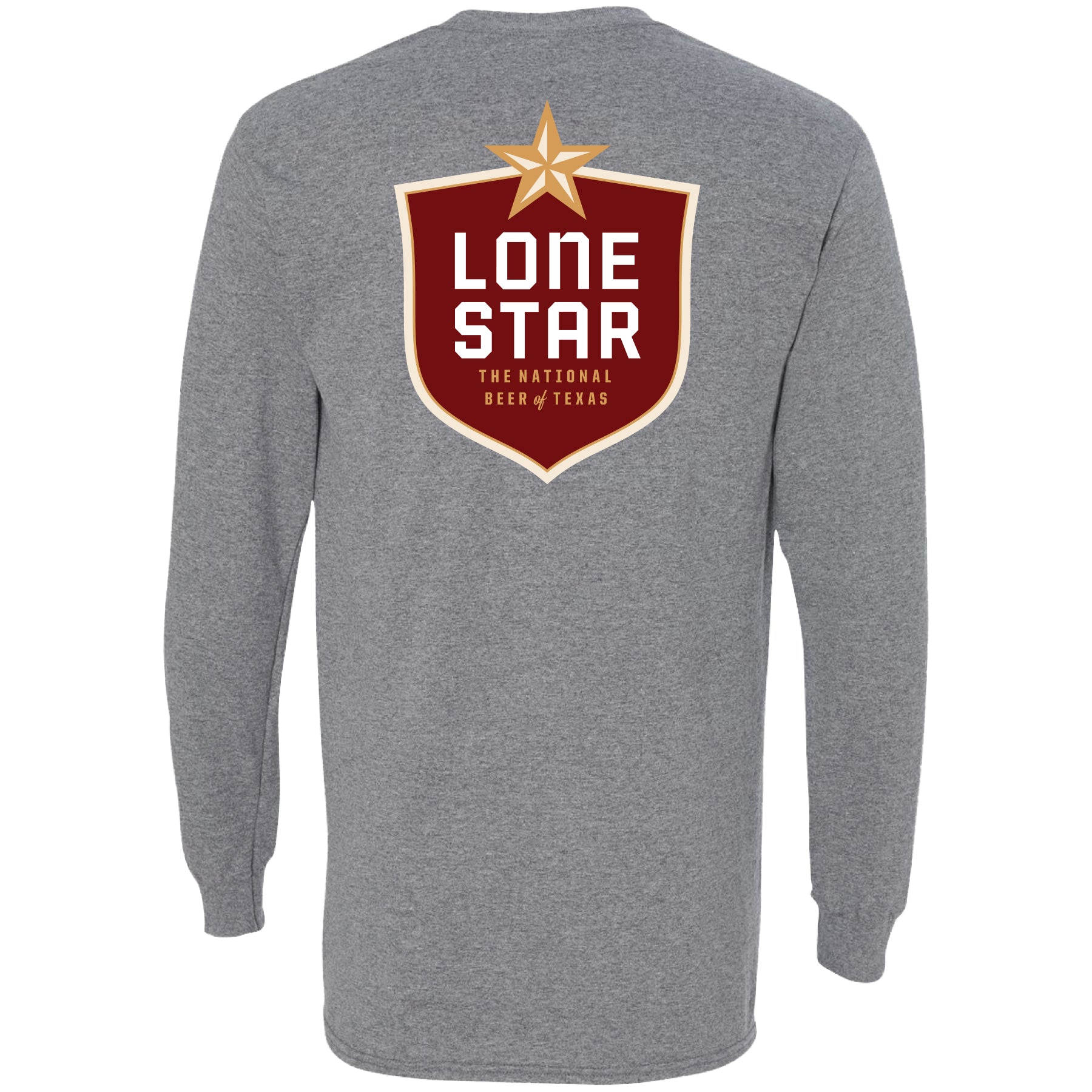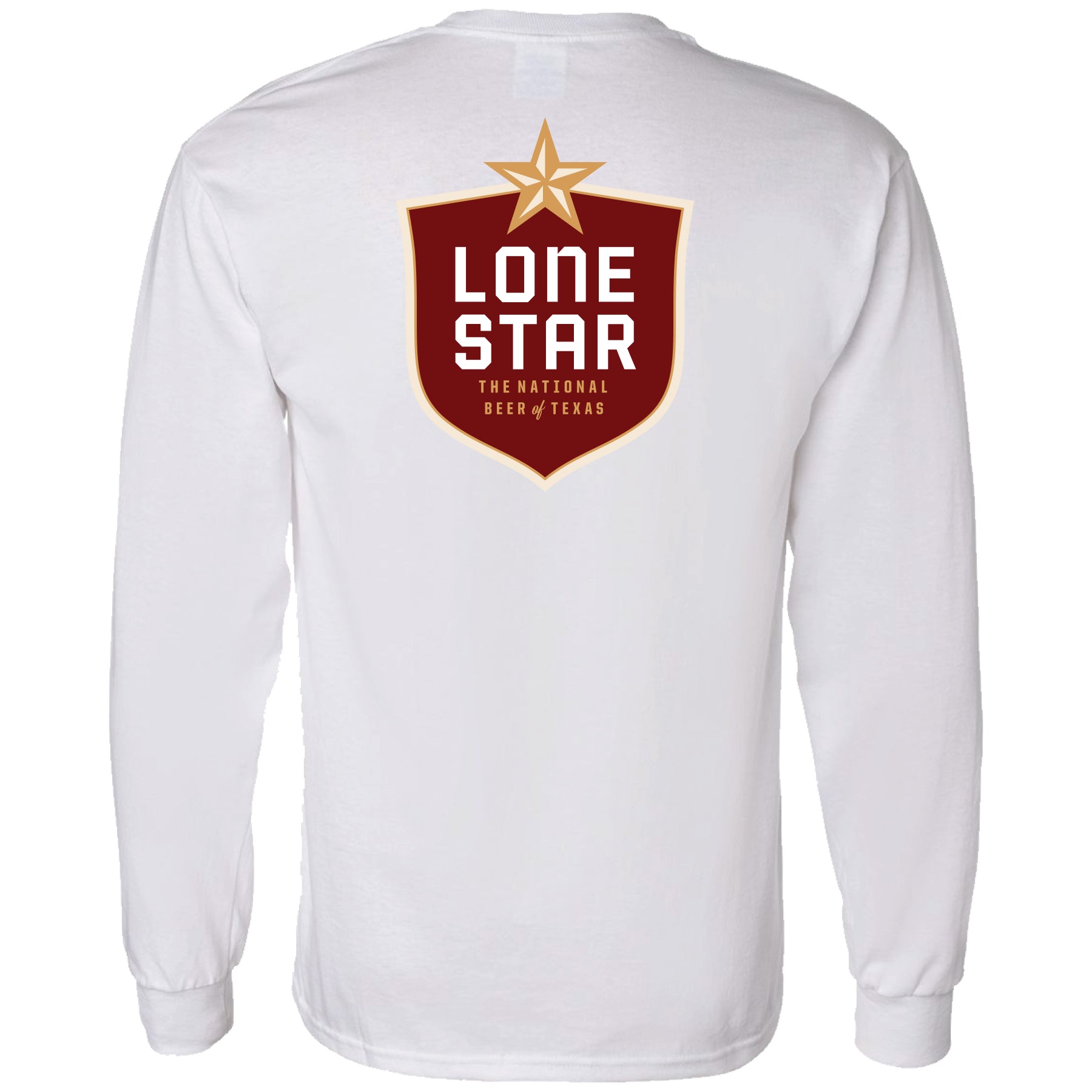 Stay warm and stylish with the Lone Star Crest 2-Sided Long Sleeve T-shirt. This shirt features a unique design on both the front and back, showcasing the iconic lone star symbol. Perfect for any Texas or Lone Star State enthusiast. Officially licensed Lone Star® apparel.