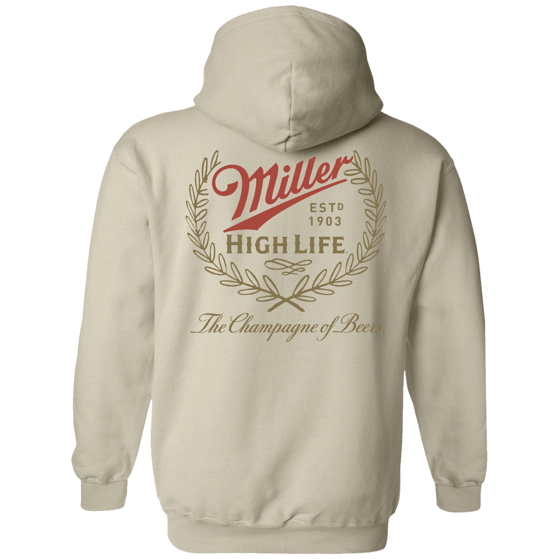 Experience the classic taste and style of Miller High Life with our Wreath Logo 2-Sided Hoodie. Featuring the iconic logotype on the left chest and a full Wreath graphic on the back, this sweat is perfect for any fan. Show off your love for Miller High Life in style and comfort. Officially licensed Miller High Life® clothing & apparel.