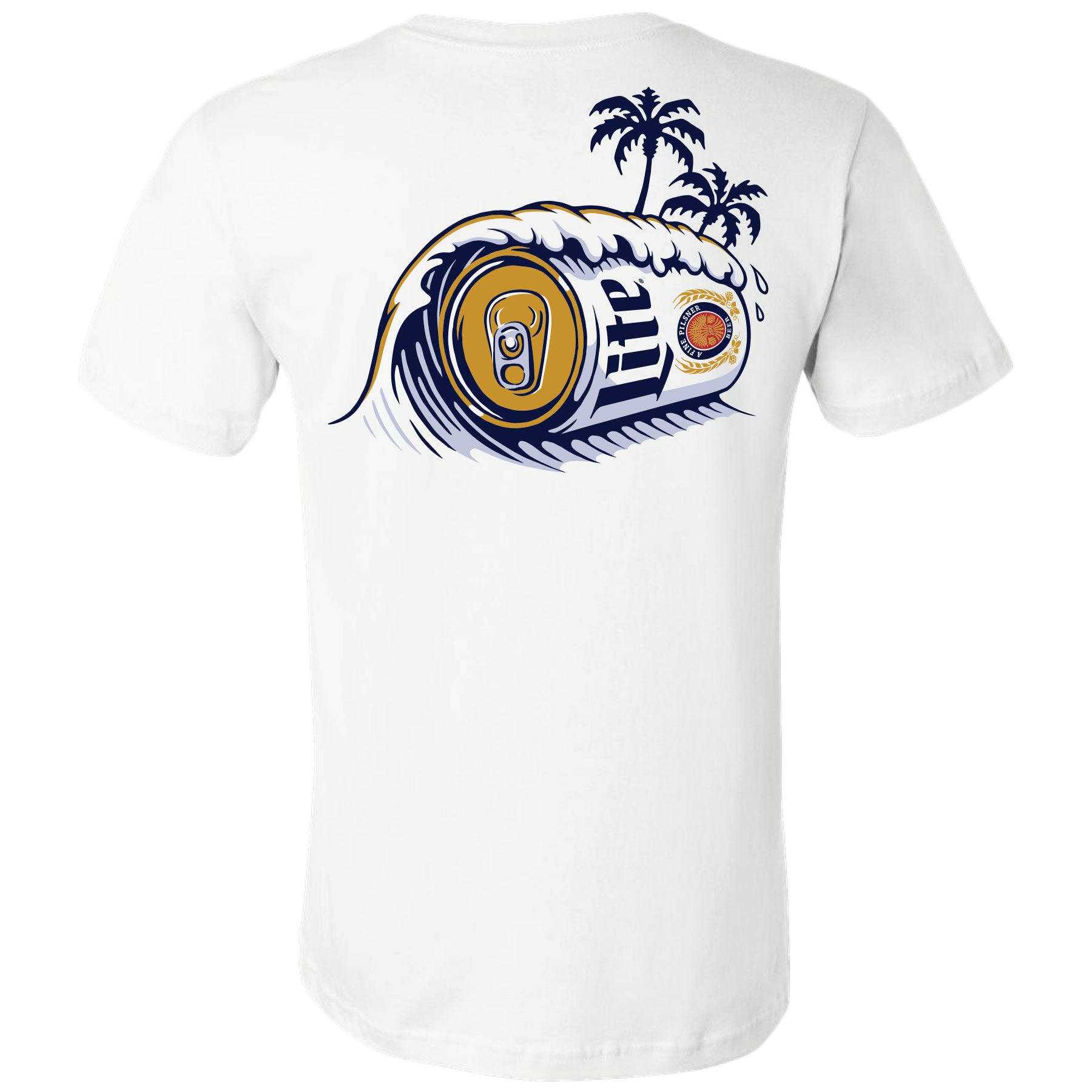 Show off your love for Miller Lite in style with our Waves 2-sided T-shirt. Featuring the iconic Miller Lite logo on the front and a unique wave design with a can on the back, this t-shirt is the perfect blend of comfort and style. Made with high-quality materials, you'll want to wear it again and again. Officially licensed Miller Lite® clothing, apparel & merch.