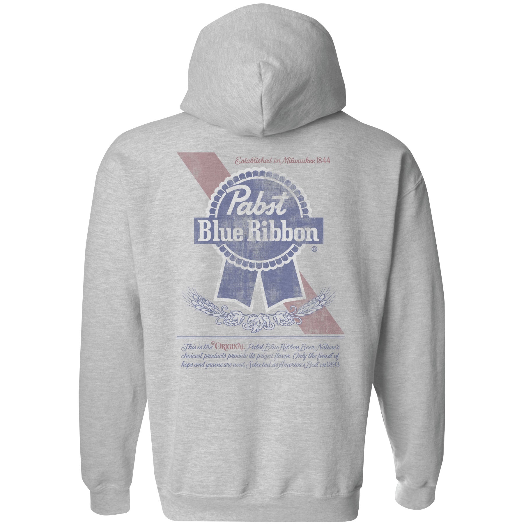 This Pabst Can Label Hoodie features a large faded label print, showcasing the iconic Pabst Blue Ribbon can design. Made from soft, comfortable fabric, it's a stylish and unique addition to any wardrobe. Perfect for fans of Pabst Blue Ribbon beer or those who appreciate a vintage-inspired look. Officially licensed Pabst Blue Ribbon® clothing & apparel.