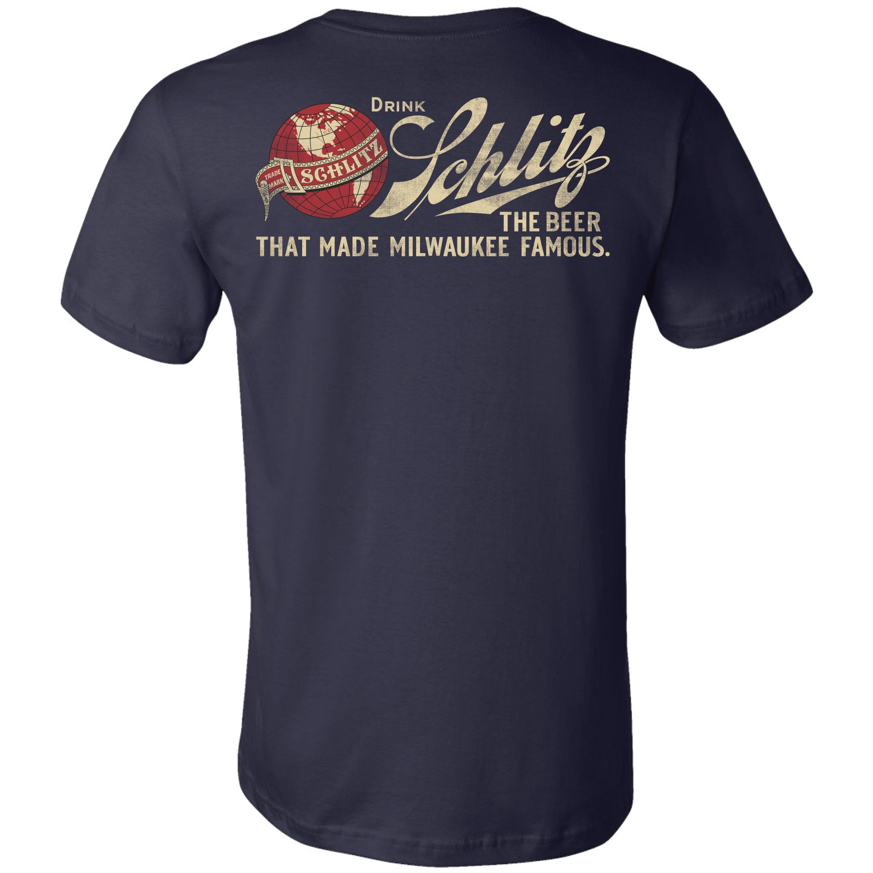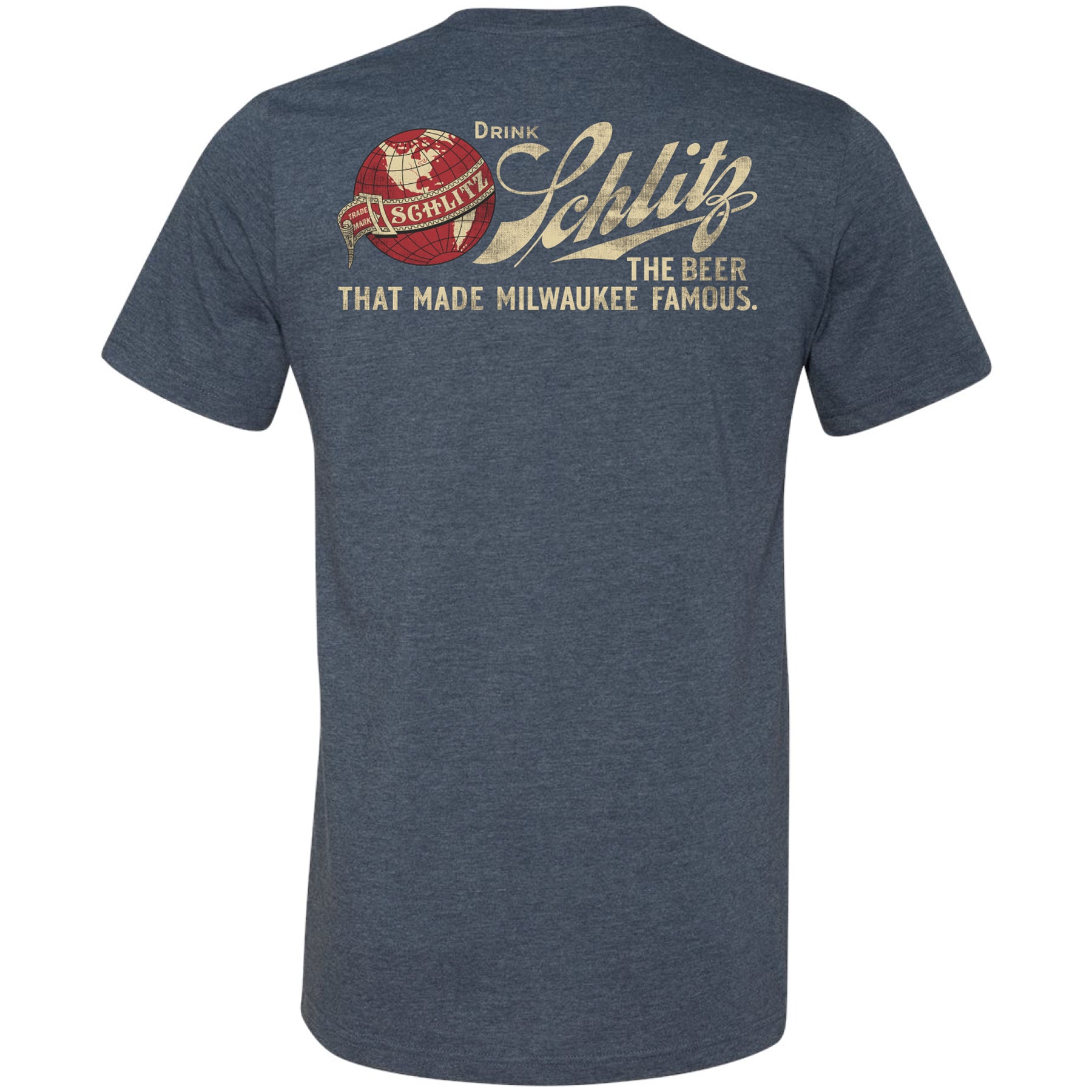 This Schlitz Vintage Drink 2-Sided T-Shirt features the iconic Classic Schlitz Script Logo on the left chest and the Vintage Globe art on the back. Perfect for those who appreciate the history and legacy of Schlitz. Officially licensed Schlitz® clothing & apparel.