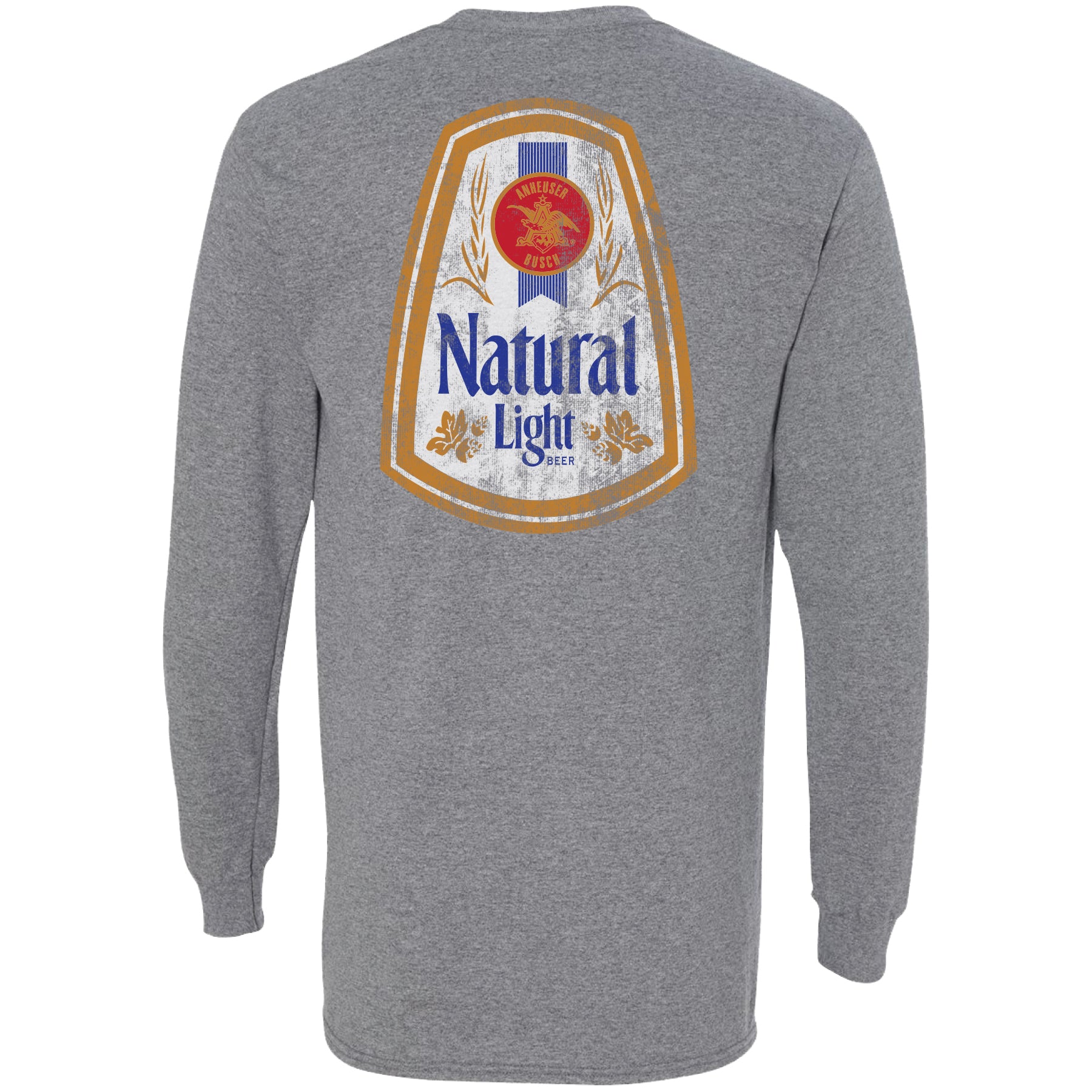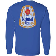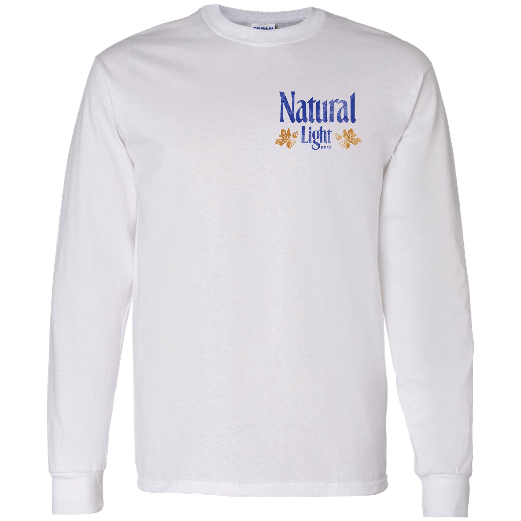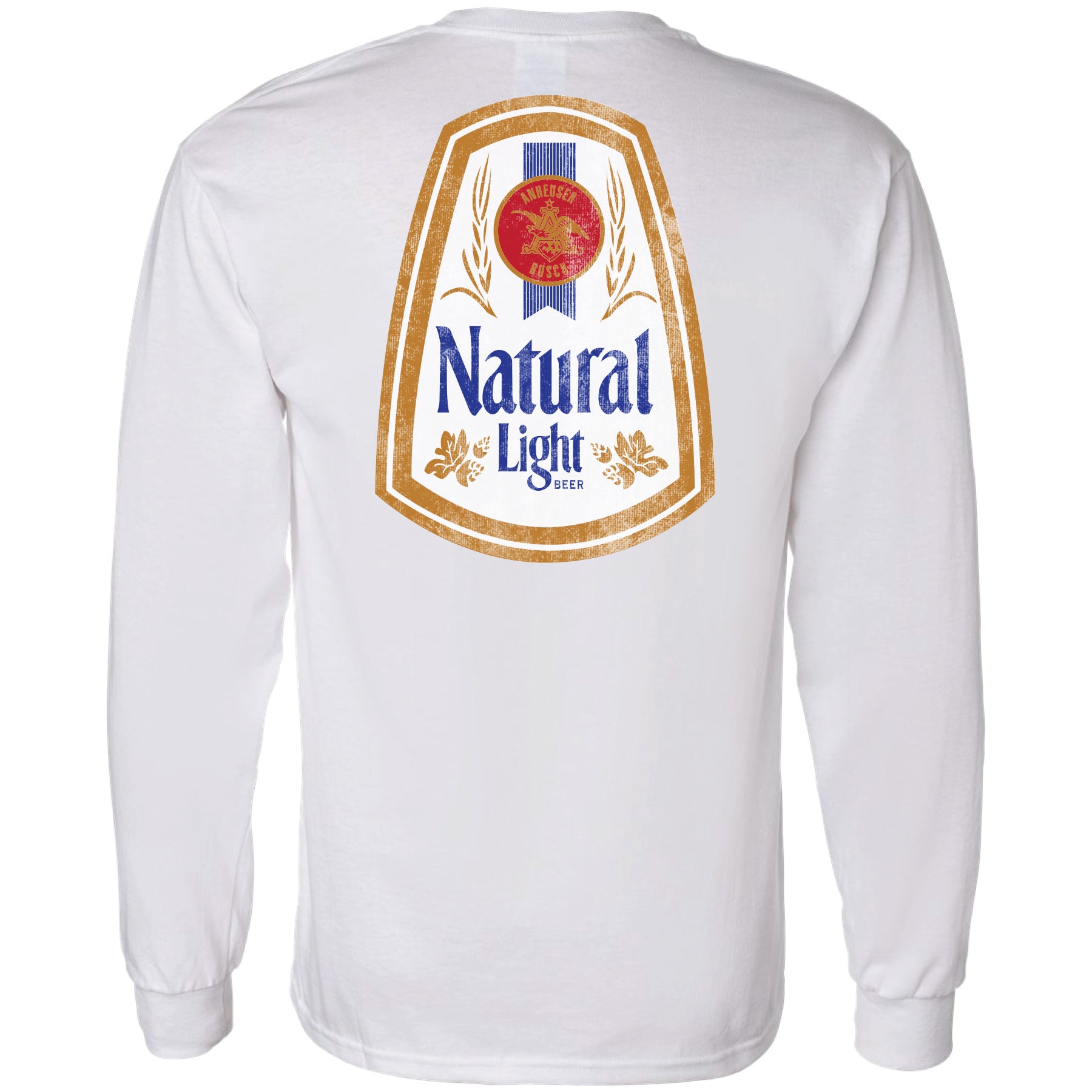 Natural Light Vintage Logo/Label 2-Sided Long Sleeve T-Shirt. The left chest features the Vintage Natural Light Logo and the Vintage Natural Light Label appears on the back of the T-Shirt. Officially licensed Natural Light® clothing & apparel.