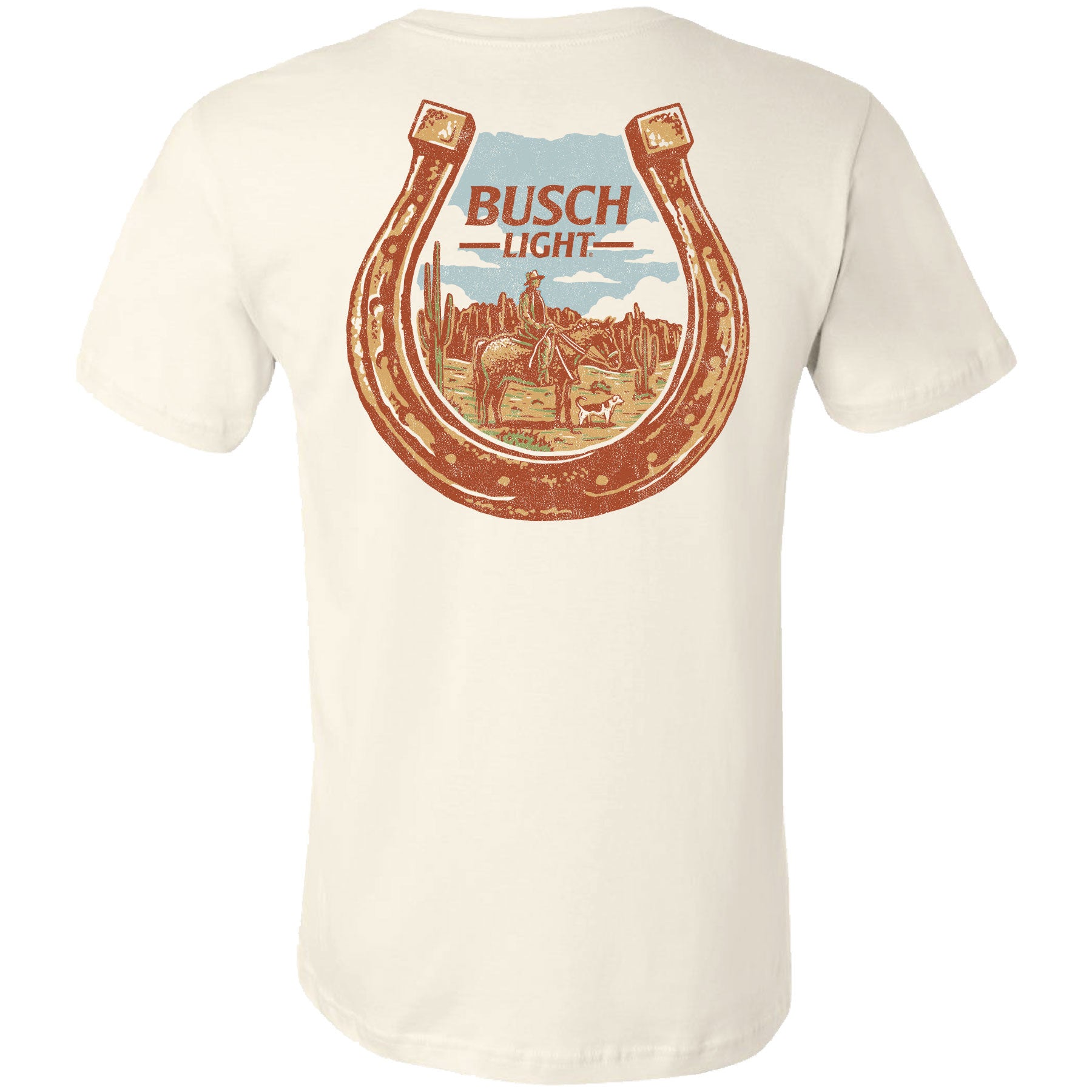 Rock your love of Busch Light with this classic rodeo-inspired tee. Featuring the iconic Busch Light logo embroidered on the left chest and a bold horseshoe graphic dominating the back, this two-sided design delivers authentic Western style. Perfect for game days, casual outings, or showing your brand loyalty in comfort. Made for fans who appreciate quality apparel with character. Officially licensed Busch Light® clothing, apparel & merch.