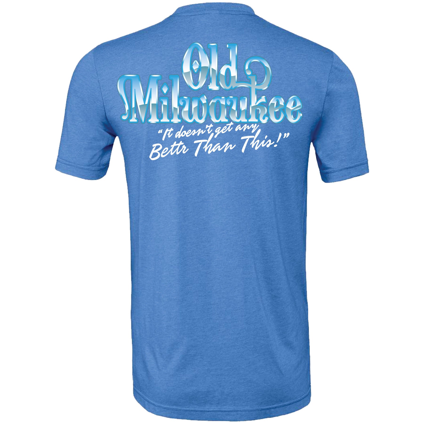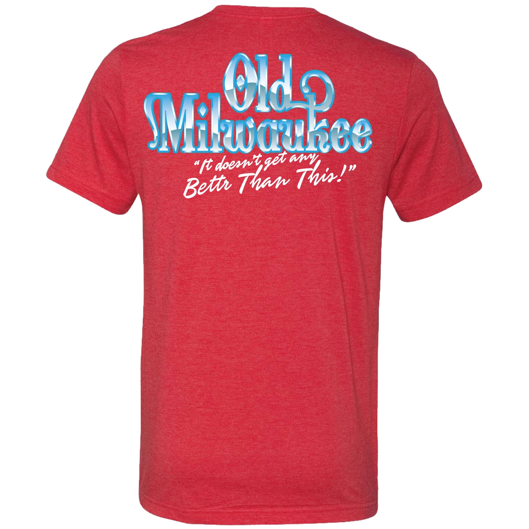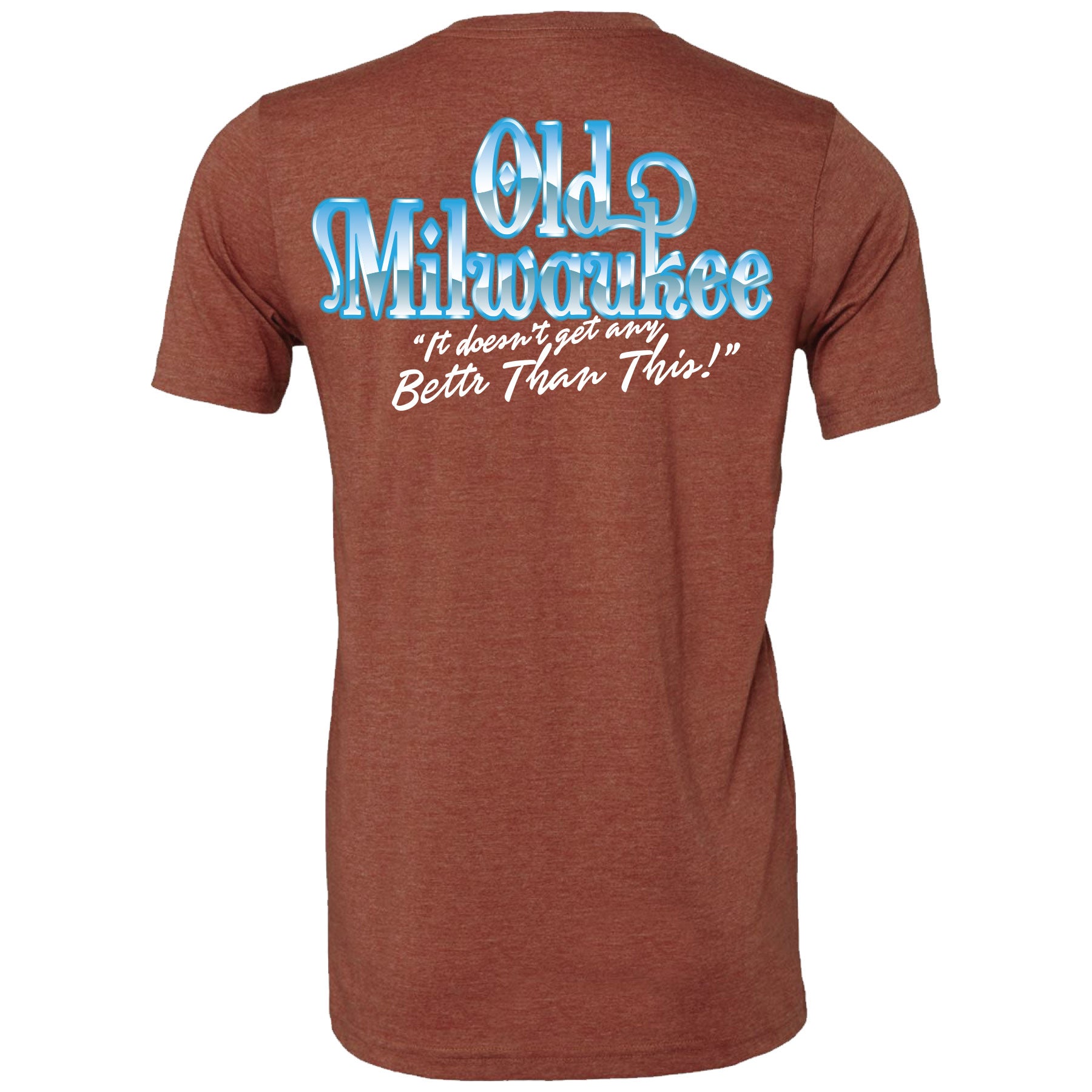 Celebrate classic style with the Old Milwaukee "It Doesn't Get Better Than This!" two-sided t-shirt. Featuring a striking chrome looking finish on the iconic Old Milwaukee logotype and crest, this shirt combines vintage charm with bold accents. The left chest displays the crest logo, while the back showcases the eye-catching phrase, making it perfect for fans who appreciate timeless branding with a modern twist. Comfortable and stylish, this t-shirt lets you wear your loyalty with confidence. Officially licensed Old Milwaukee® clothing & apparel.